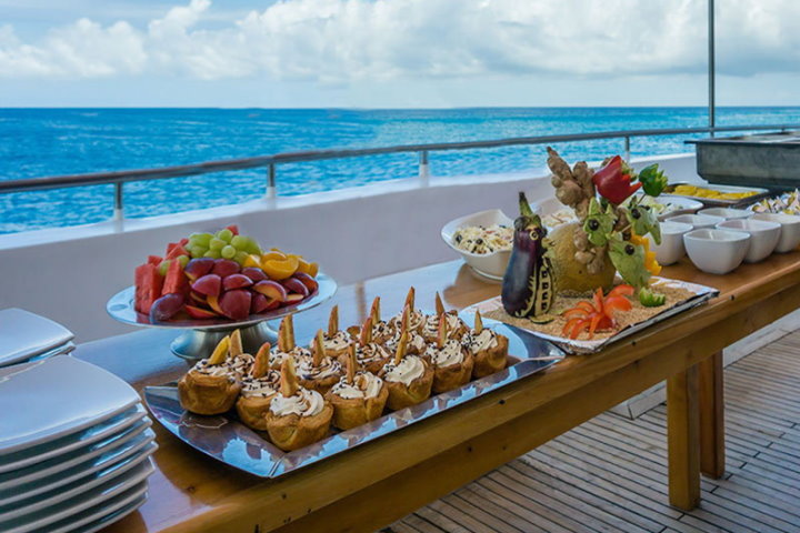 The catamaran’s eight cabins comfortably house 16 passengers. Each cabin comes with a choice of one queen or two twin beds, picture windows, and private baths with abundant hot water. Safe-deposit boxes and individual air-conditioning allow for maximum security and comfort.
